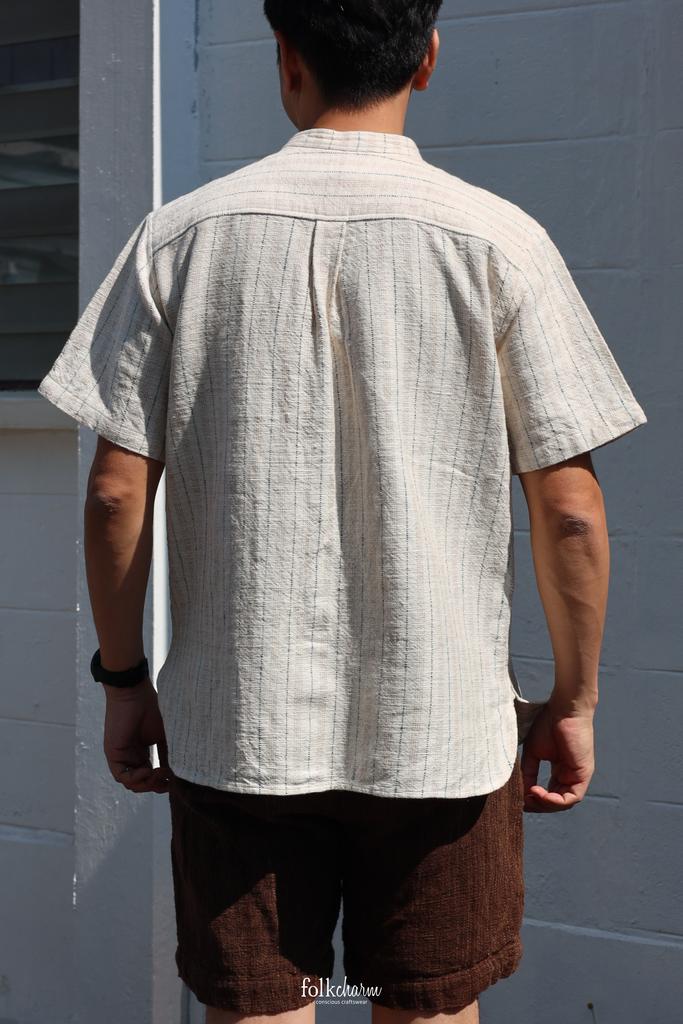 This shortsleeve mandarin collar shirt is playful in the use of 3 contrasting colors of nature: earth, rivers and forest.