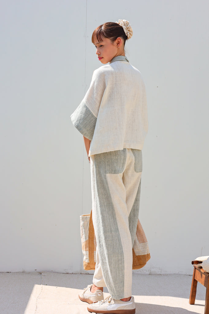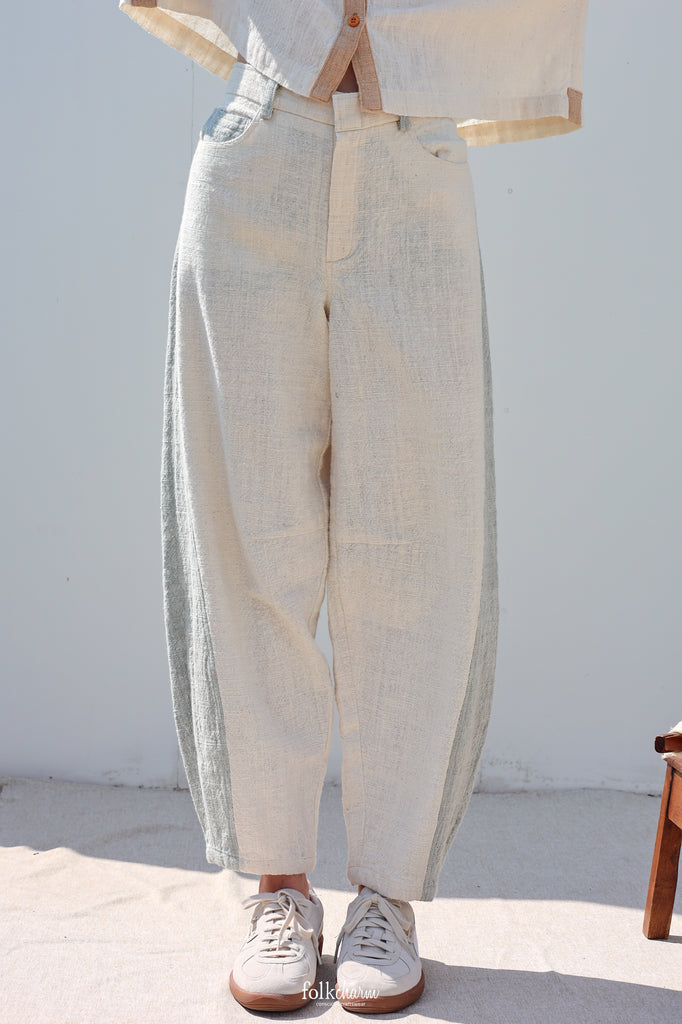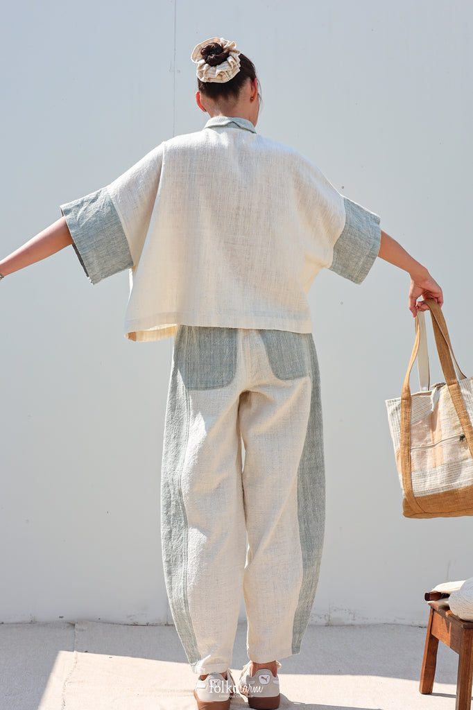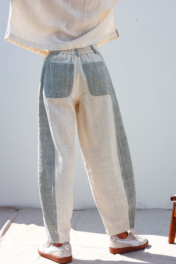 Barrel รุ่นนี้มีทั้งแบบทูโทนและสีเดี่ยว โดยรุ่นทูโทนตัวนี้ทอจากเส้นฝ้ายเข็นมือแท้ สีฟ้าอมเทาเกิดจากการย้อมสดด้วย “เบือก” พืชห้อมเลื้อยพื้นถิ่น